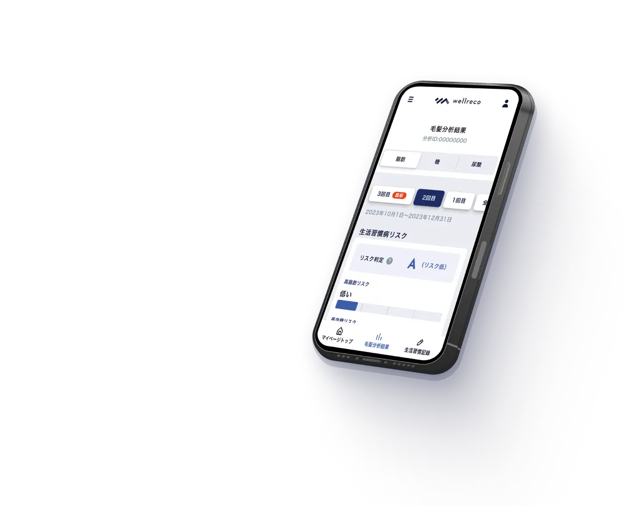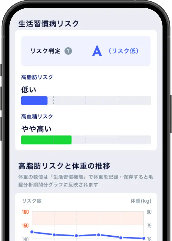 髪を切るだけで簡単に過去3カ月分のリスクの状態がわかるのがいいですね!最近、健康が気になる、という主人にも勧めてみようと思います。おかげさまで、目標ができてこの歳でもがんばれています。