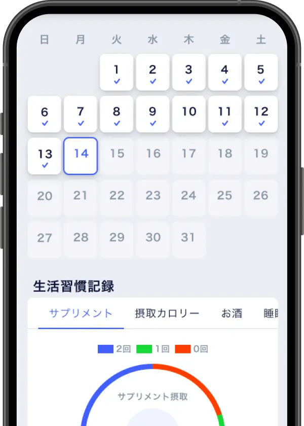 摂取カロリー、お酒、睡眠など、健康リスクにつながる生活習慣5項目を毎日記録することができます。